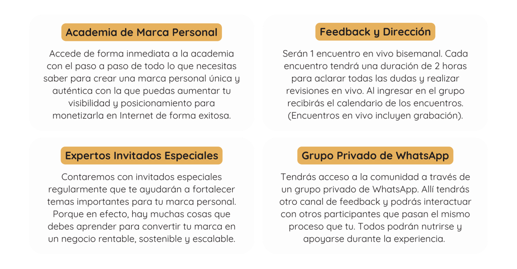 Las sesiones en vivo quedan grabadas y tendrás acceso a la grabación dentro de tu grupo privado y la Academia de Marca Personal. Aun así, te animo a participar en tiempo real para aprovechar el espacio de retroalimentación. También puedes solicitar feedback previo a la sesión para recibir respuesta y verlo en la grabación.