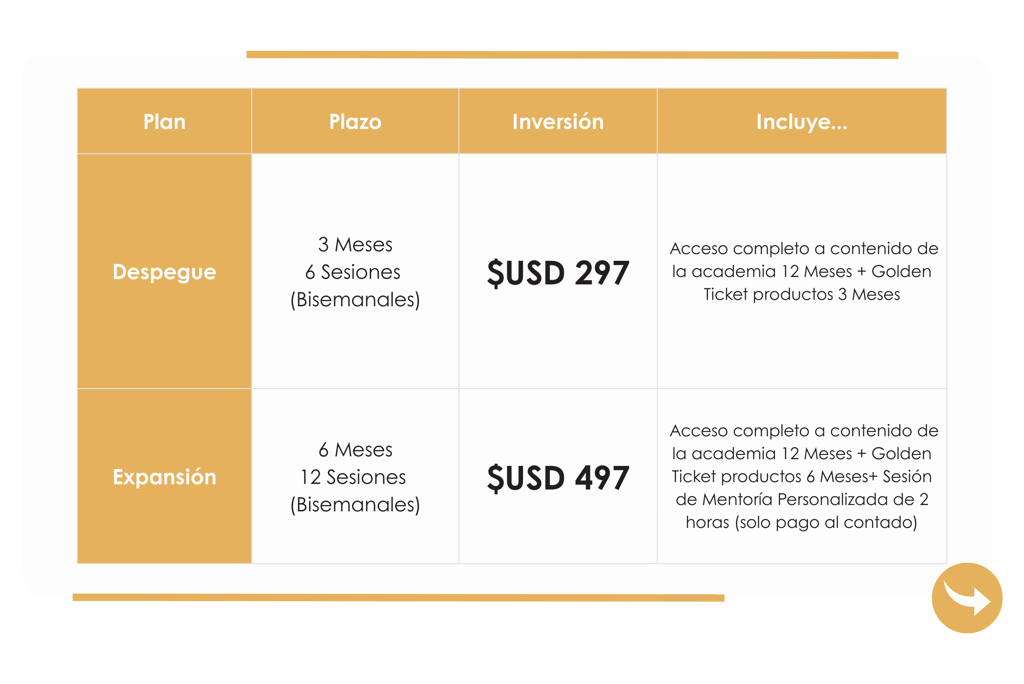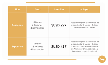 Solo el Plan Expansión de 6 meses tiene acceso a mentoría 1-1 con el pago al contado. Por tiempo limitado y especial de lanzamiento 30% de descuento $348 y $208 dólares americanos por 6 y 3 meses.