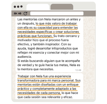 Es un programa de formación guiado directamente por mí, tu mentora, Nela Materán. Acompañaré al grupo a alcanzar sus objetivos combinando estrategia, experiencia y aprendizaje colaborativo. Te guiaré desde un camino que ya recorrí (y que sigo recorriendo), porque una Marca Personal no se construye en un día… se cultiva todos los días.