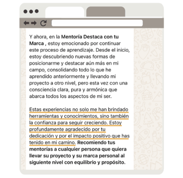 La Mentoría Destaca Pro nació como una extensión viva de mi propósito: ayudar a otros compartiendo y enseñando lo que aprendo y aplico en mi. Decidí rescatar mi experiencia de varios años para ayudar a profesionales como yo a construir una marca personal con alma, estrategia y visión.